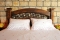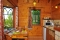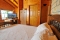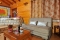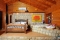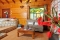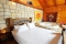 Wood log outside, the inside is done in warm, honey-colored wood with old stone on the main wall and around the enormous Jacuzzi. The color scheme is warm and inviting.